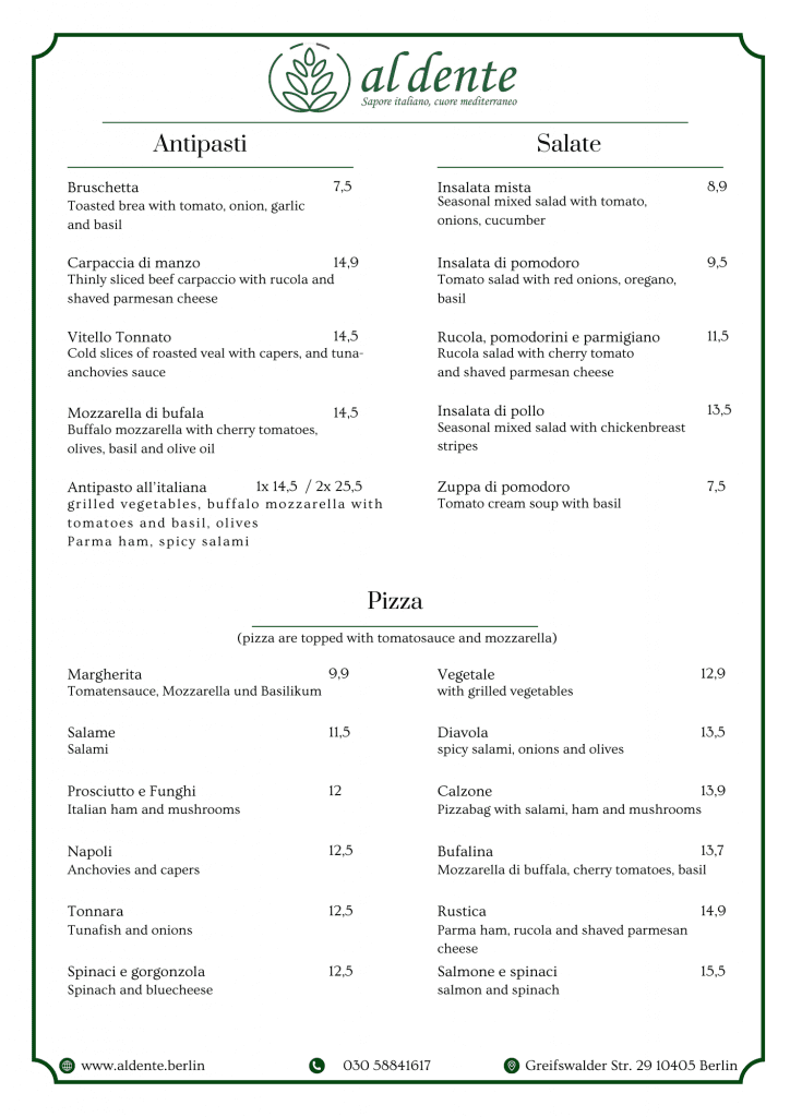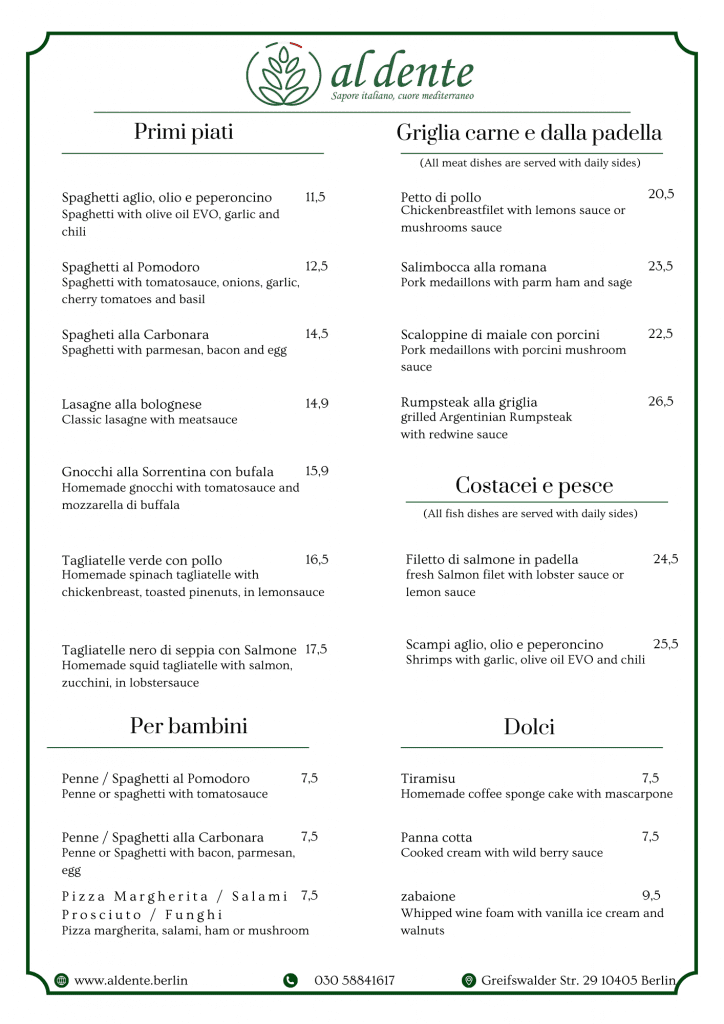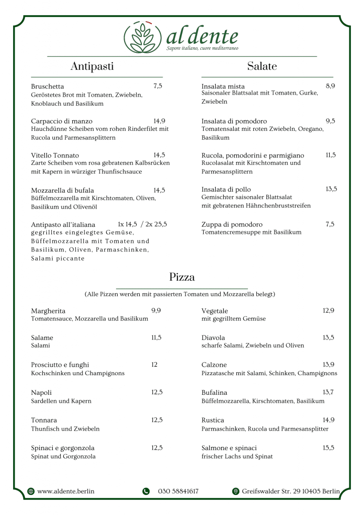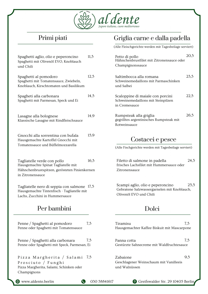 Unsere Speisekarte bietet eine Vielzahl von köstlichen Gerichten aus frischen Zutaten. Von Vorspeisen bis hin zu Hauptgerichten bietet unsere Speisekarte Optionen für jeden Gaumen. Egal, ob Sie Lust auf Meeresfrüchte, Pasta oder ein saftiges Steak haben, unsere Speisekarte hat etwas für Ihren Heißhunger. Vergessen Sie nicht, Platz für das Dessert zu lassen, denn wir haben eine Auswahl an dekadenten Leckereien, um Ihr kulinarisches Erlebnis zu vervollständigen.
